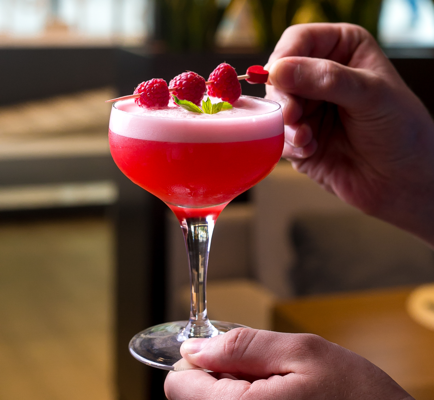 Miscelate il tutto in un recipiente, quindi filtrate con un semplice colino in una coppa e servite con decorazioni di petali di rose o con lamponi, per un tocco ancora più romantico.